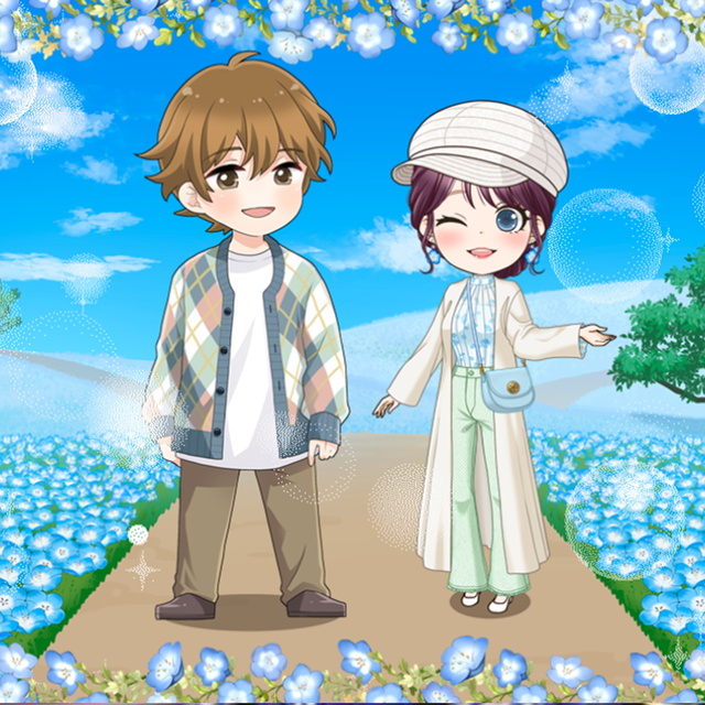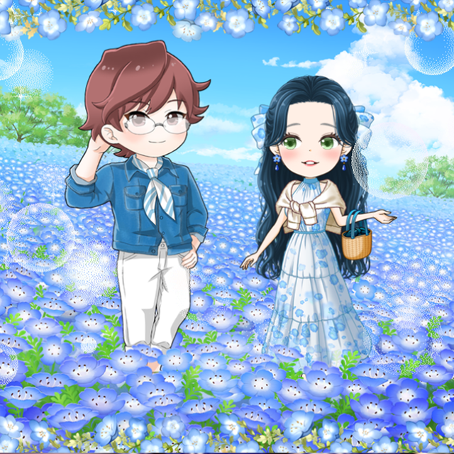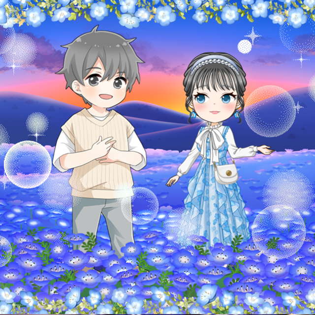 フリルたっぷりのワンピに大きな胸元リボンが目を引くブラウスを合わせて、気分はネモフィラ畑のお姫様💓夕焼けに染まる美しい景色に溶け込む気持ちは二人だけの秘密💋///