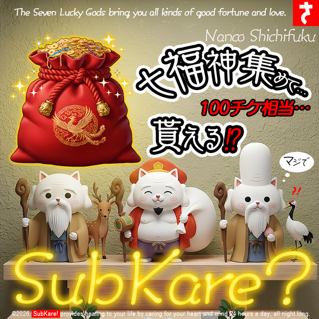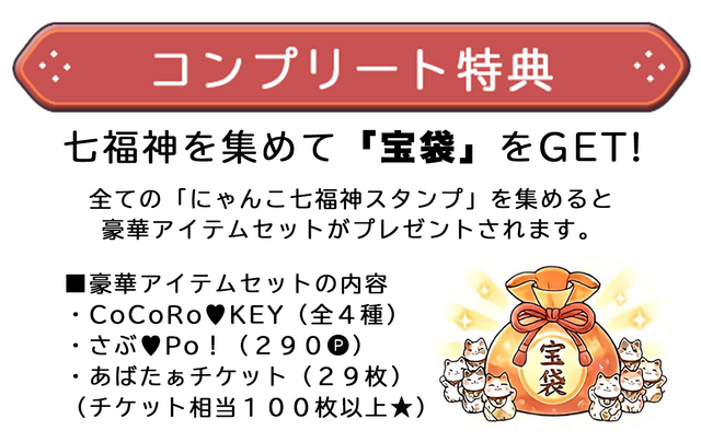 ■「七福神集め」の「にゃんこ七福神(全7種)」のアバターおよびスタンプを獲得できるのは、終了時刻までとなります。終了時刻を過ぎた場合、「にゃんこ七福神」は取得できません。